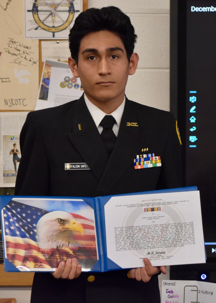 Grove City High School (GCHS) senior cadet Moises Falcon has received the NJROTC Meritorious Achievement Ribbon. This is the highest award a cadet can receive and is awarded by the Area Three NJROTC Manager. The NJROTC Meritorious Award is awarded to any NJROTC cadet who distinguishes themself by outstanding, meritorious achievement.