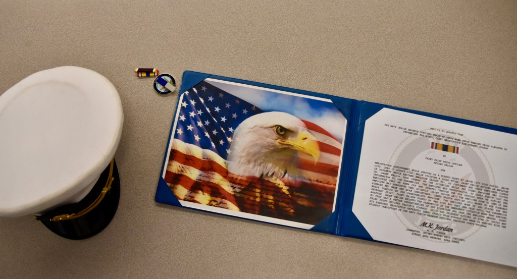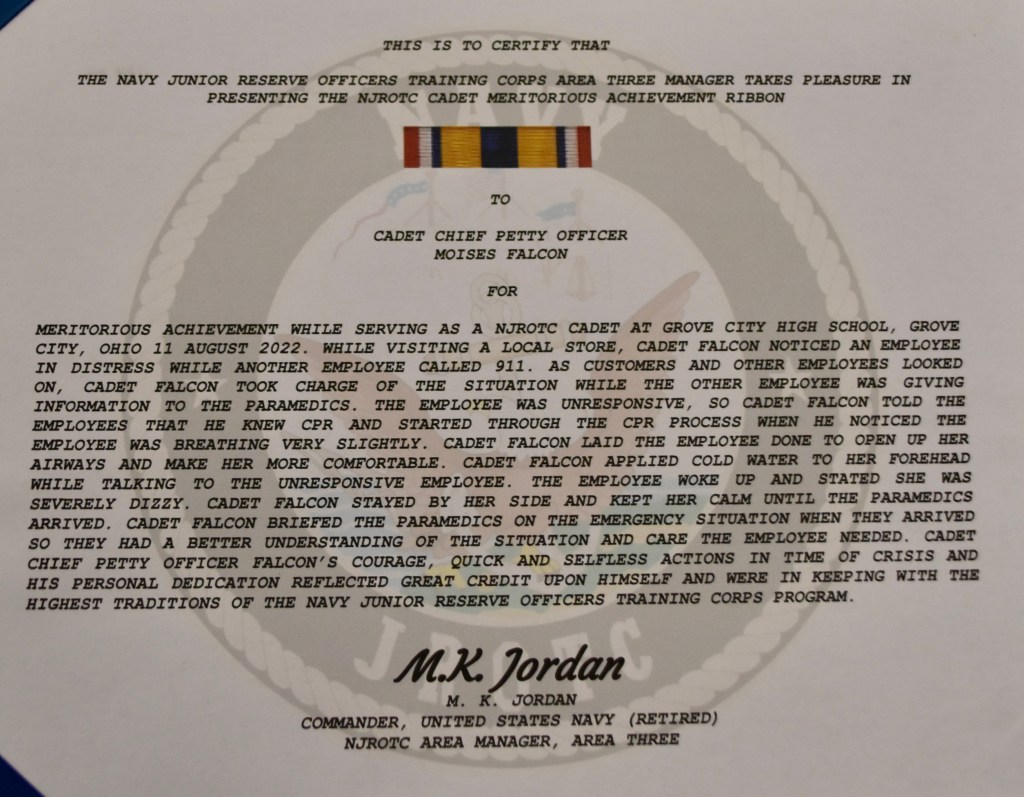 “The Meritorious Achievement Ribbon is the highest declaration a cadet can achieve,” GCHS NJROTC Commander Dustin Martin said of the ribbon Cadet Falcon earned. “It is only given out through meritorious acts, such as life-saving actions.”