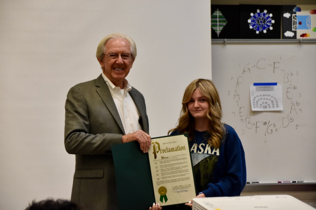 Before Marley departed for NYC to participate in the parade, Grove City Mayor Ike Stage visited Central Crossing High School to present her with a Proclamation from the city, recognizing her achievement in front of her band peers.
