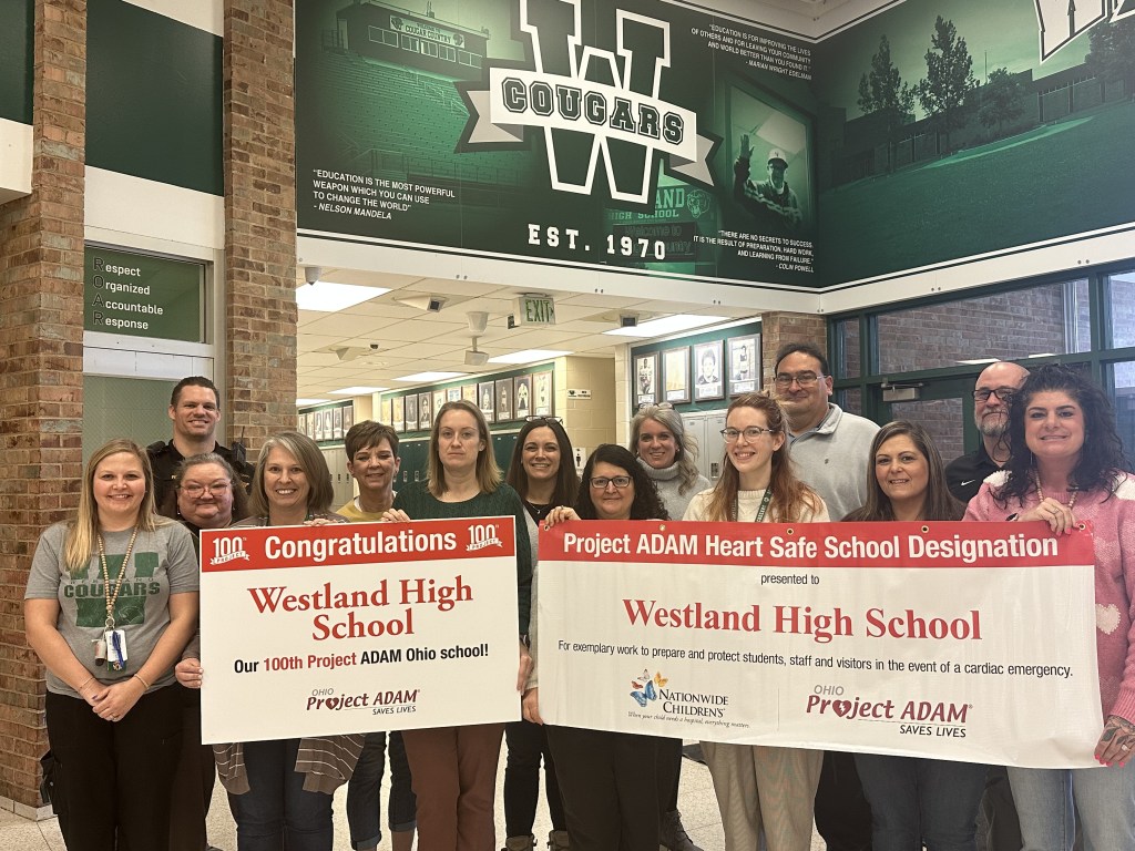 On Thursday, Westland High School (WHS) was recognized by Nationwide Children’s Hospital as their program’s 100th Project ADAM Heart Safe School in the State of Ohio. Project ADAM is a comprehensive program of sudden cardiac arrest preparedness that aims to prevent death in children and adolescents through education and implementation of life-saving programs.